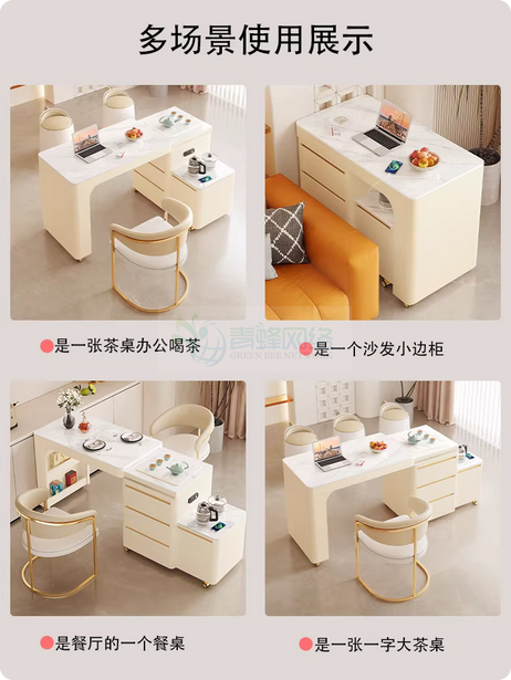 可移动伸缩旋转茶桌奶油风岩板家用小茶台小户型阳台茶桌椅组合